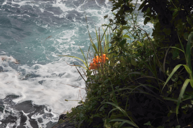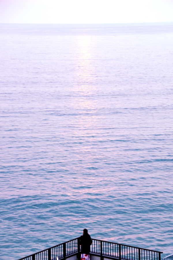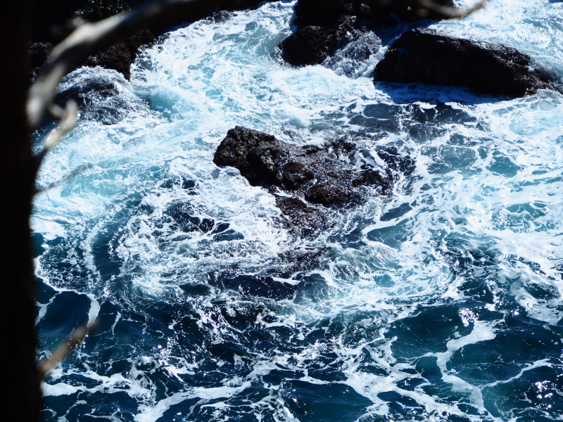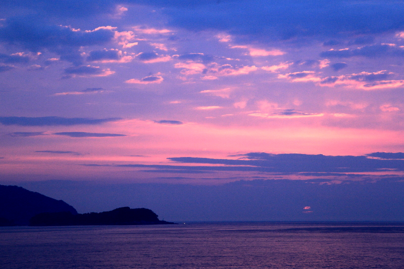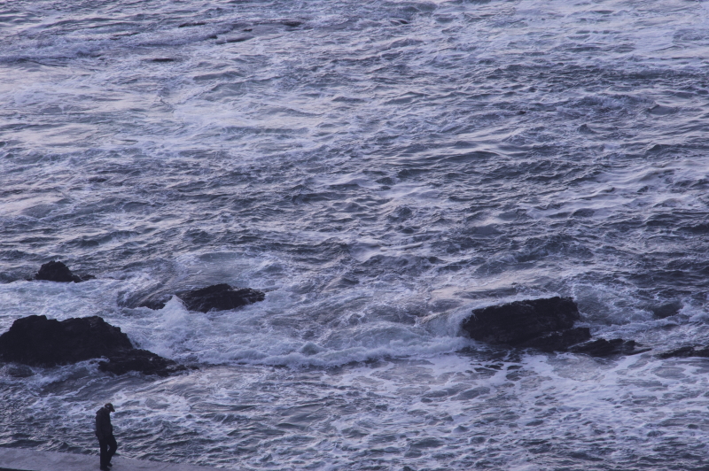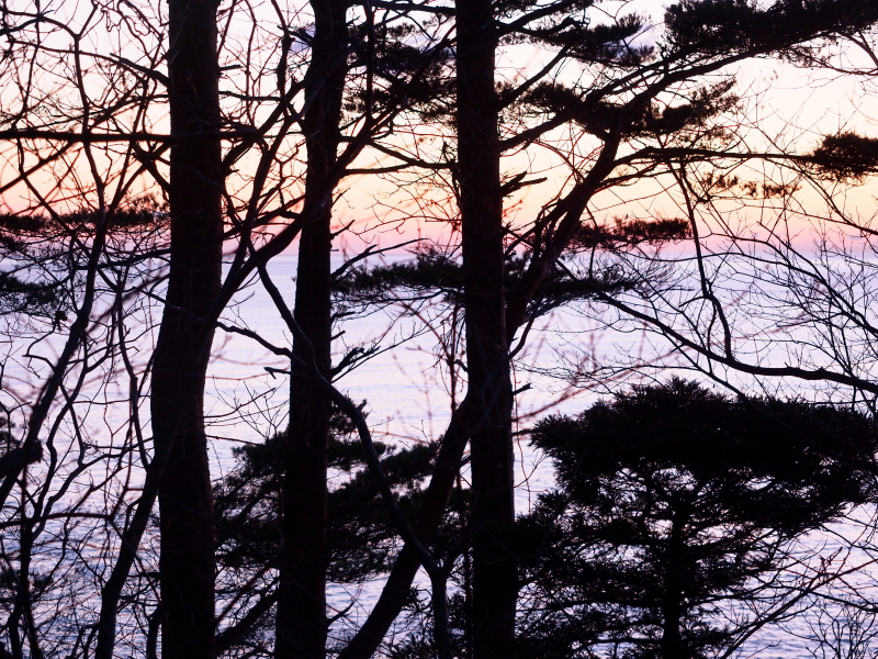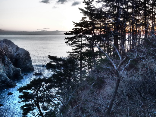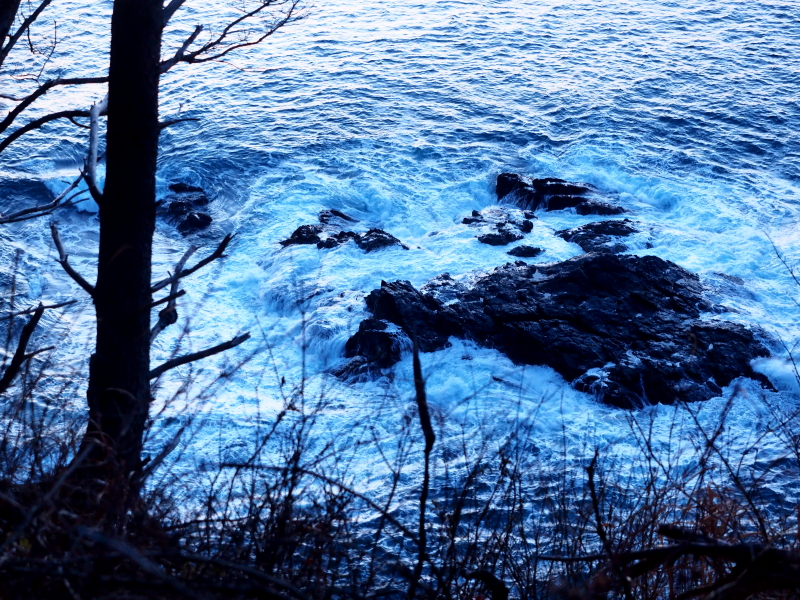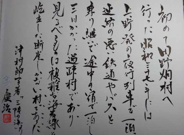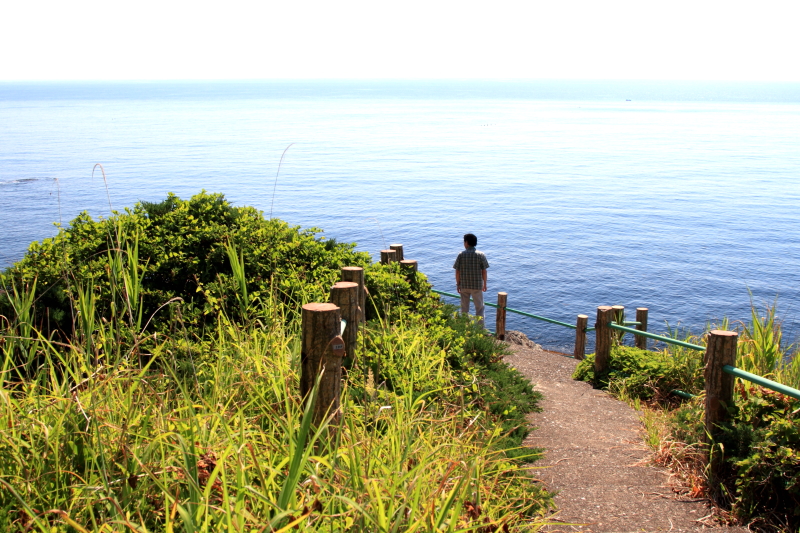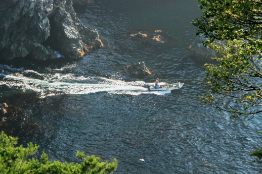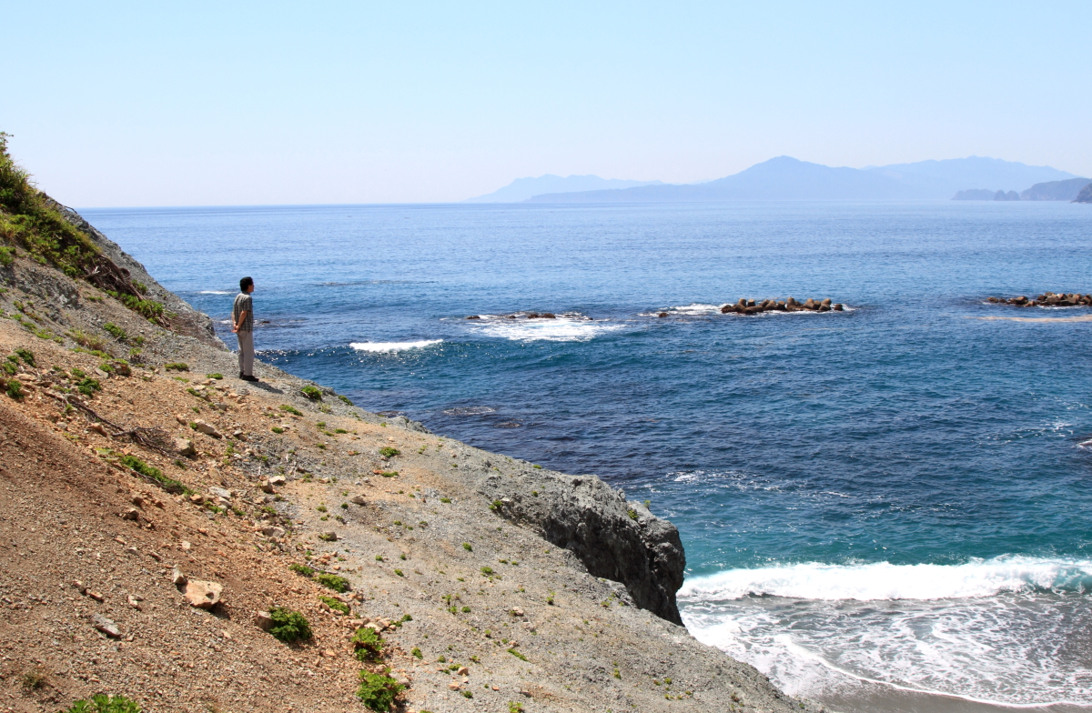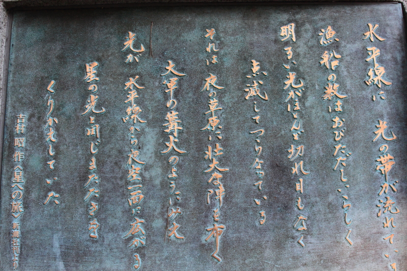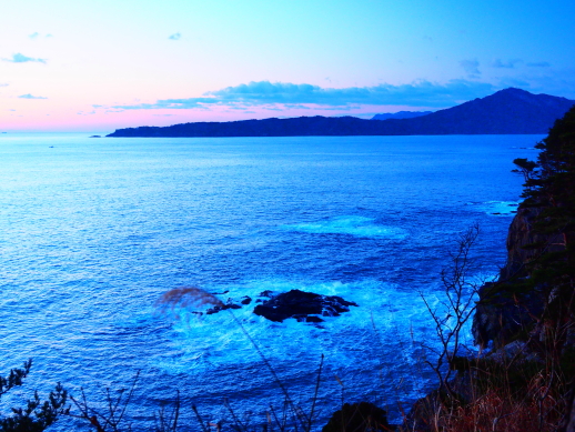「私は、潮の香りに包まれながら腹這いになって、再び切り立った崖の上から濃紺の海と砕け散る波を見た。錆び付いた私の頭が、清冽な水で洗われたようにいきいきと働き出すのを感じていた。・・・夜になると水平線に漁火が帯のようにつらなり、それを見つめながら、星野氏と炭火で焼いた鮑を肴に酒を飲んだ。久しぶりに創作意欲が激しくつき上げ、私は、頭の中で小説の構想をあれこれと考えていた。・・・」吉村昭・「私の文学漂流」