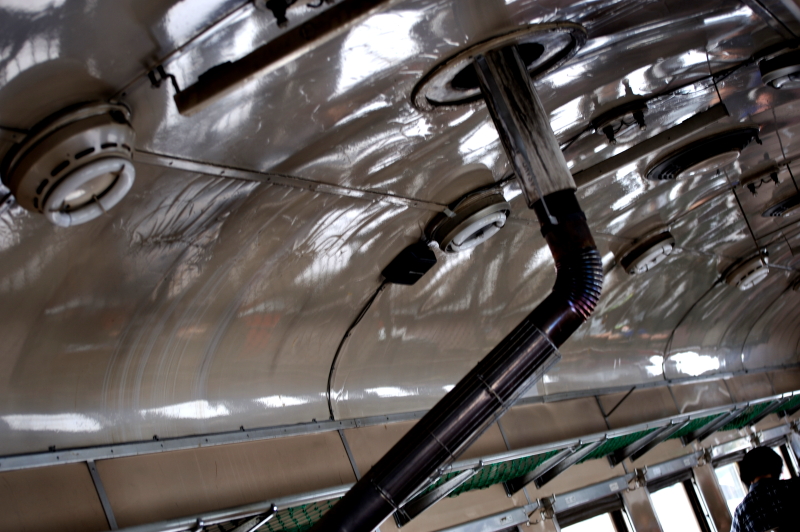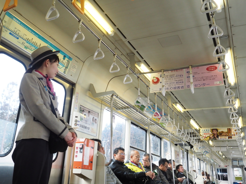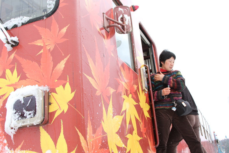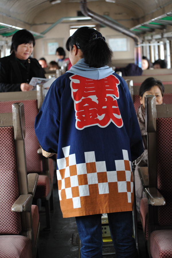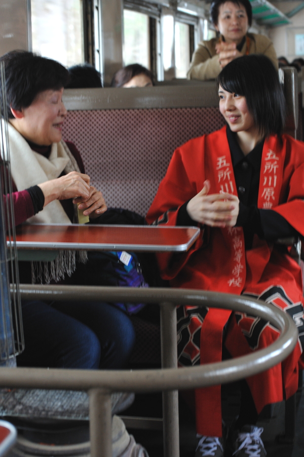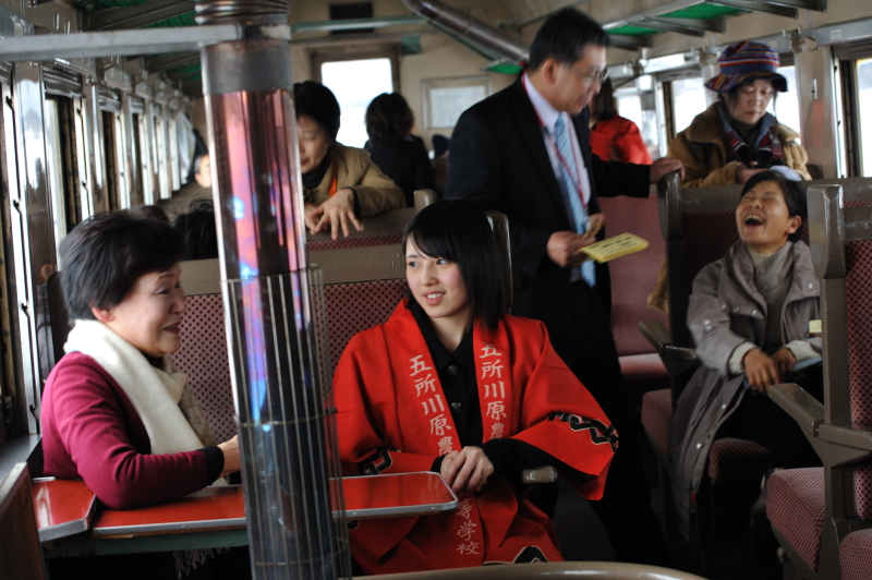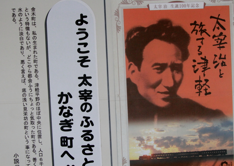 津軽鉄道の車内。「五所川原農業高校」の生徒さんが自校で作ったものの宣伝。津軽鉄道沿線には「五農校前駅」がある。
