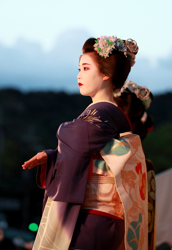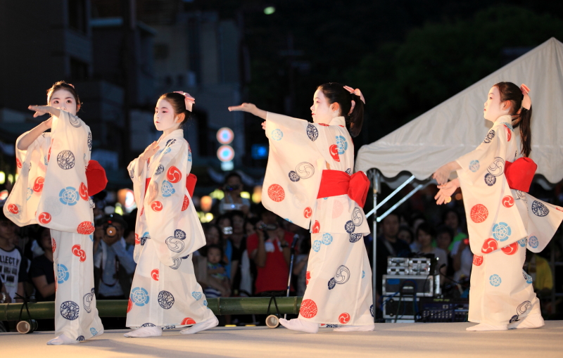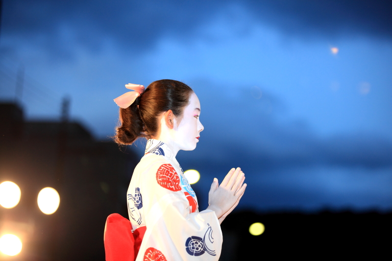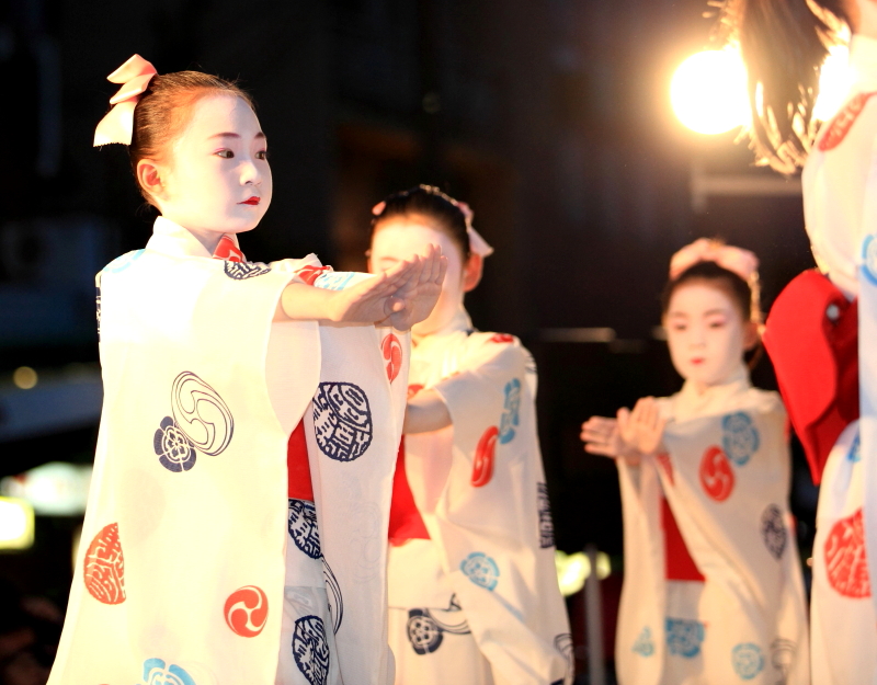 一般的なお揃いの浴衣を着て白塗り化粧をした小学生位の少女多数が可憐に舞い踊る。