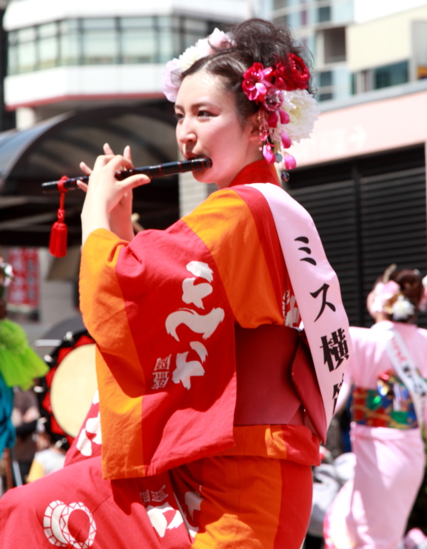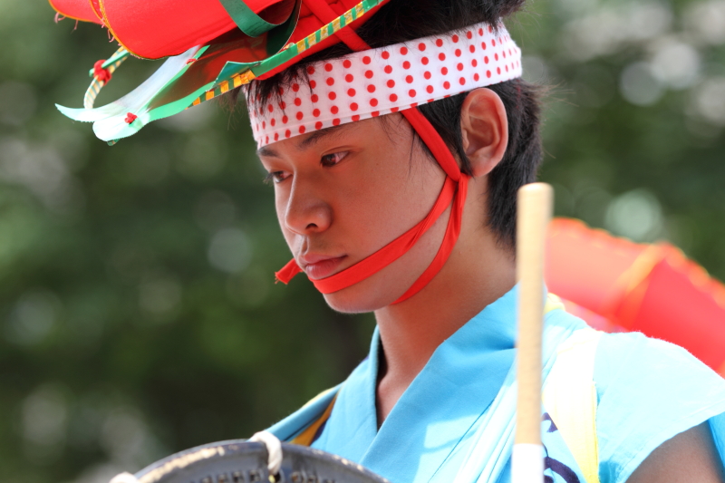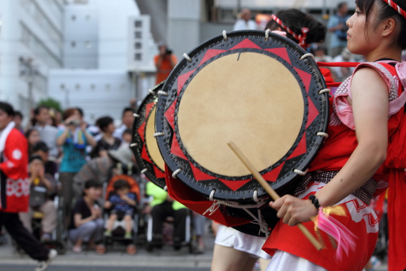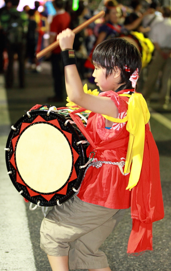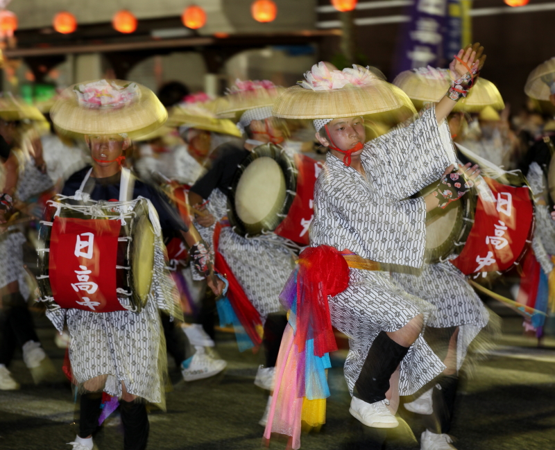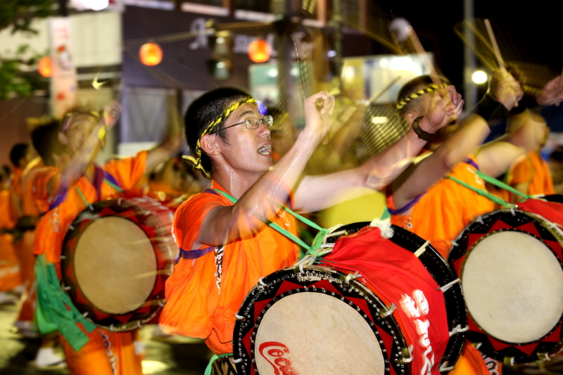 太鼓や鉦(かね)の力強いリズムと横笛や歌声に合わせ、人々が列になって大通りを踊りながらパレードする祭り。