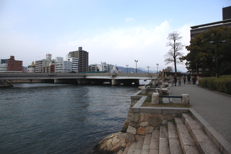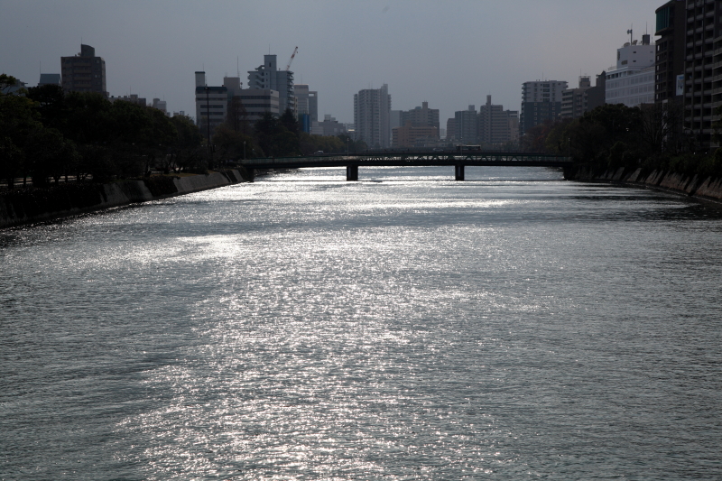 相生橋から見た本川の流れ。多くの被爆者がこの川にはいり亡くなった。左側が平和公園。