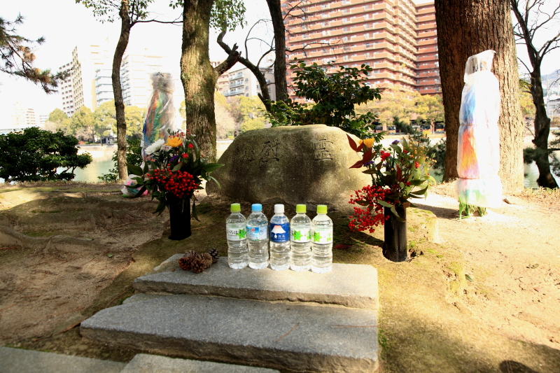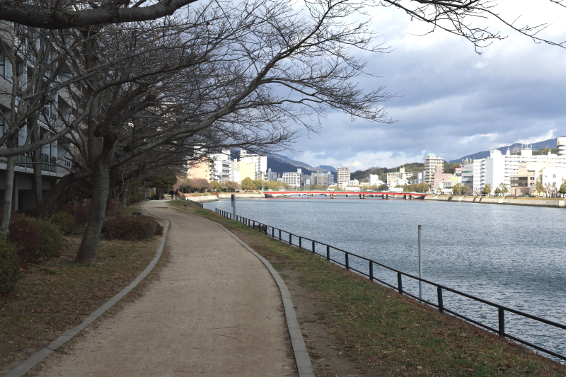 原爆資料館のところから平和公園の南側に出て、平和大通りを渡り、元安川に架かる東平和大橋の方向に歩くと、その歩道の右側に