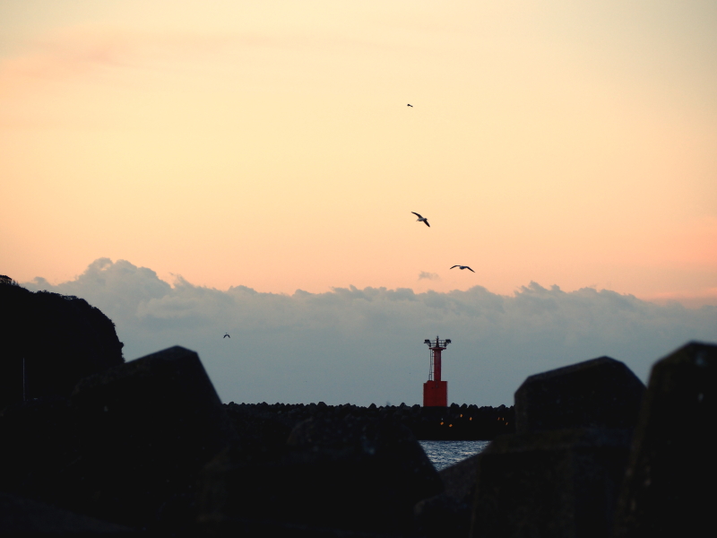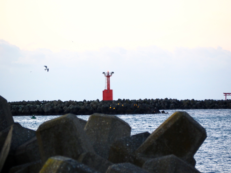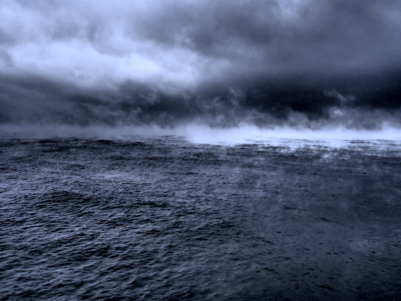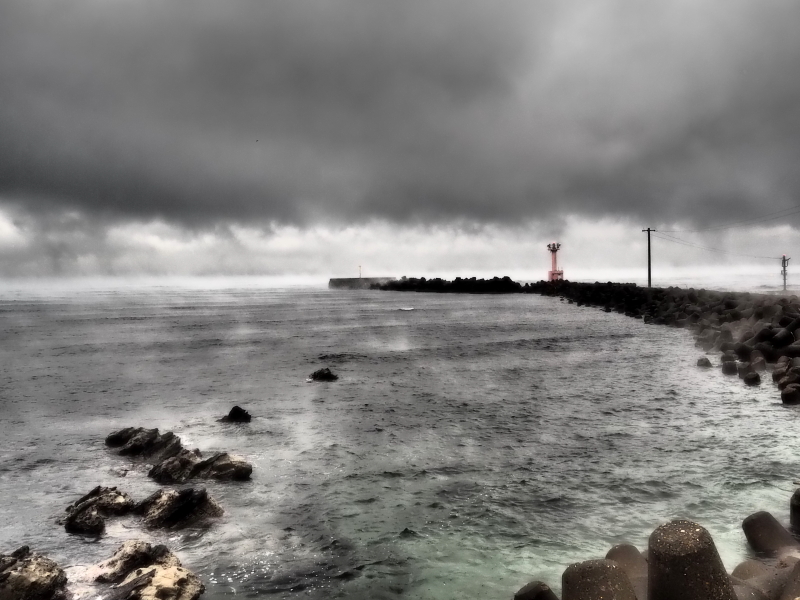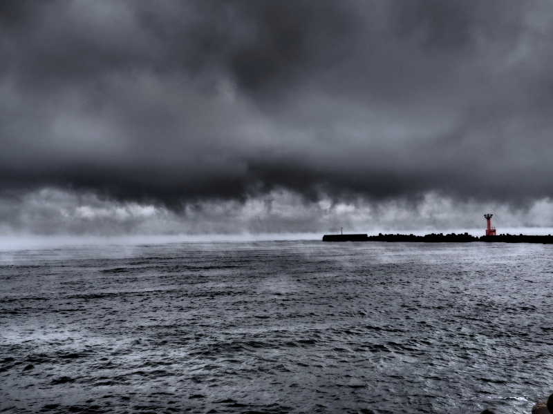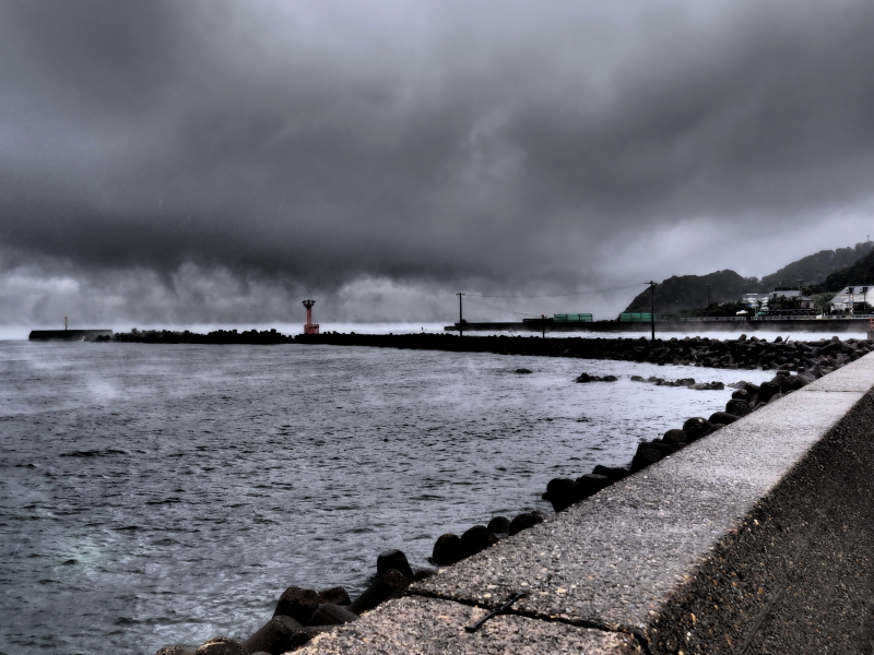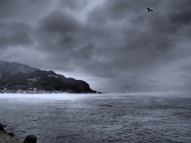 この日は早朝から荒れ模様の天候。千葉県富津市金谷の海もご覧の通り。水墨画の世界だ。