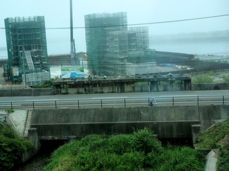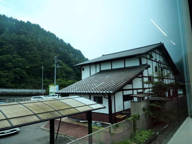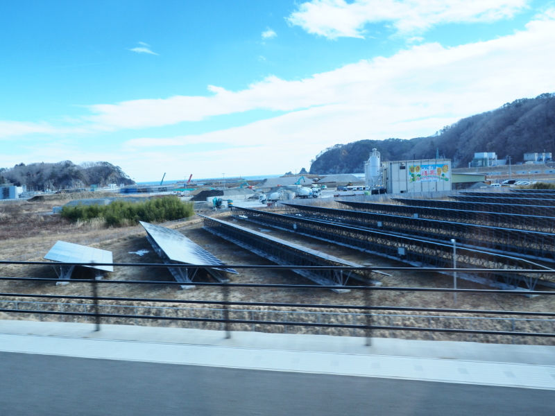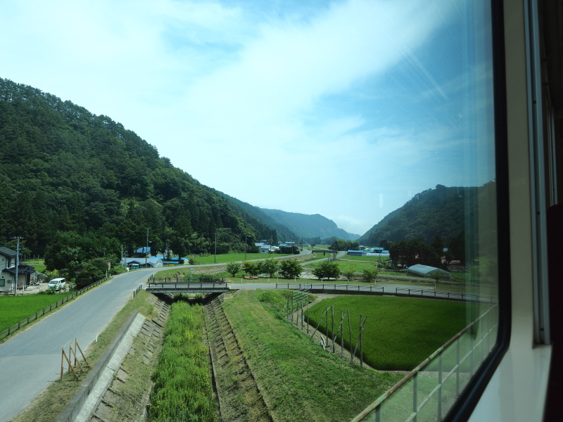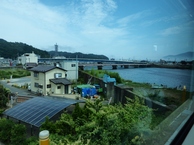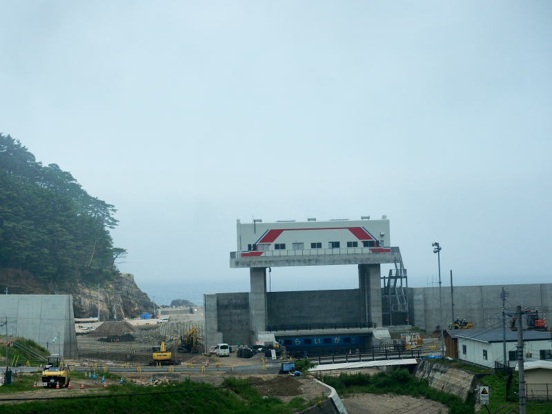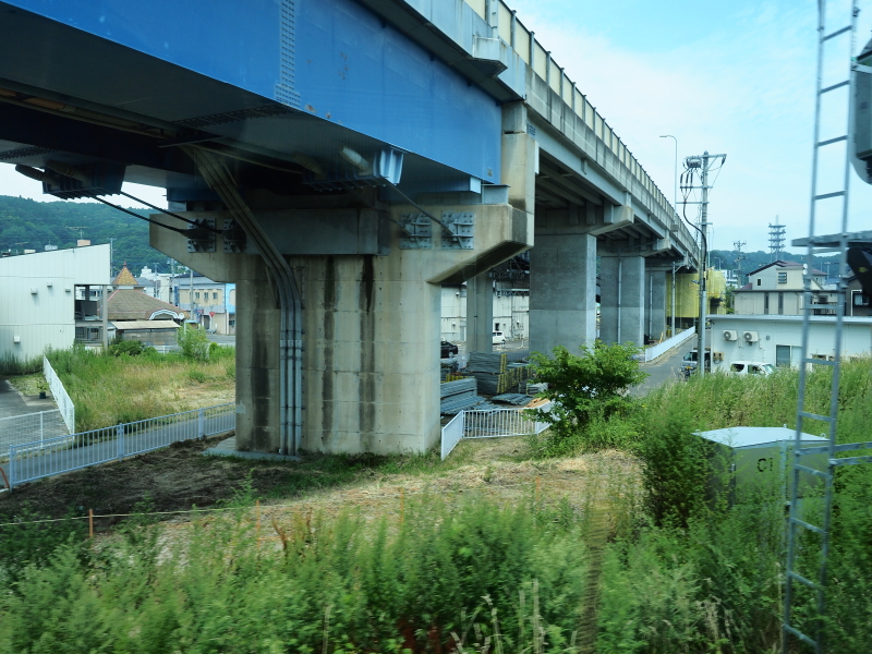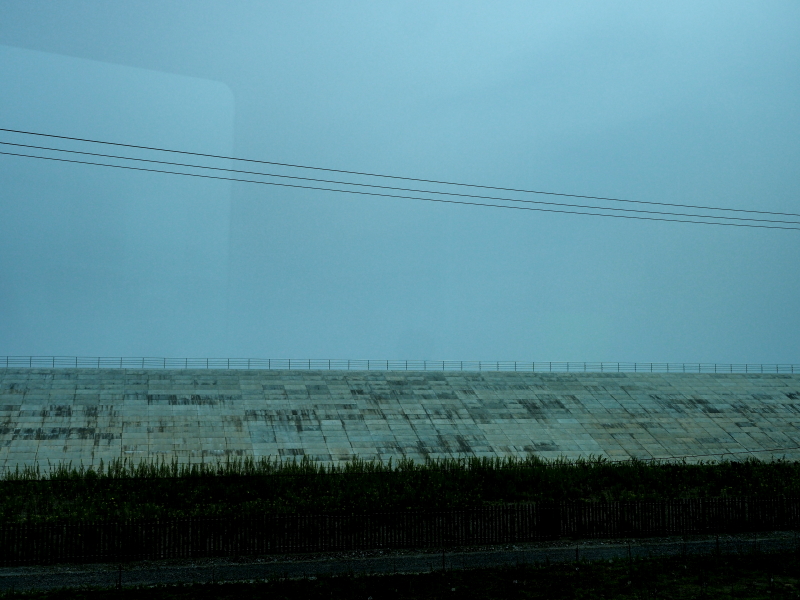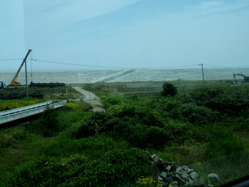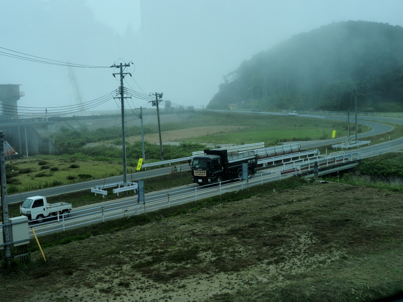 陸中宇部-野田駅周辺を走行中 高く長い堤防が続く-列車の窓からは海岸線はほとんど見えない。
