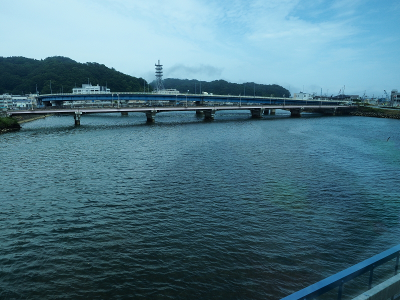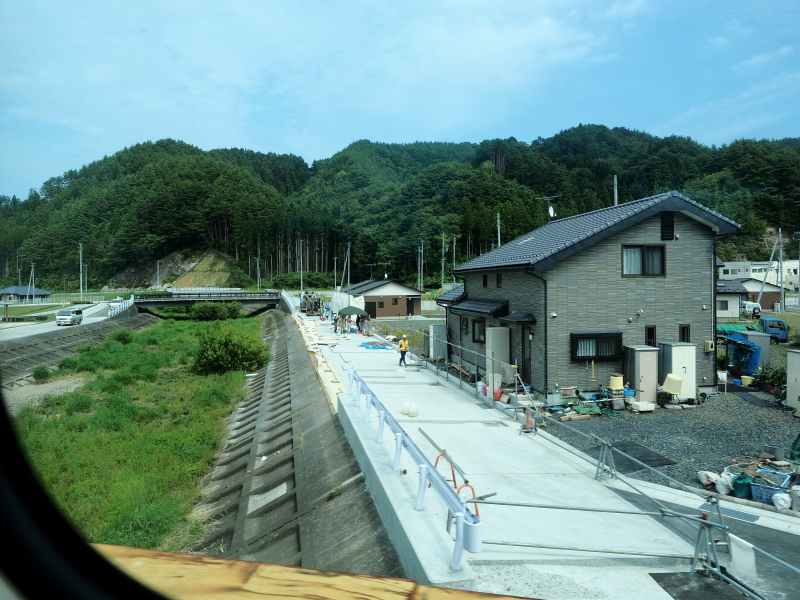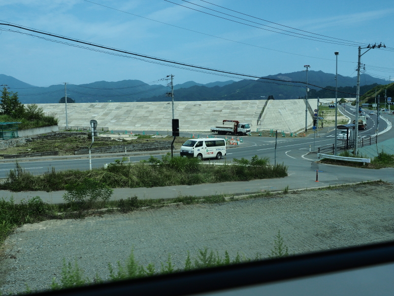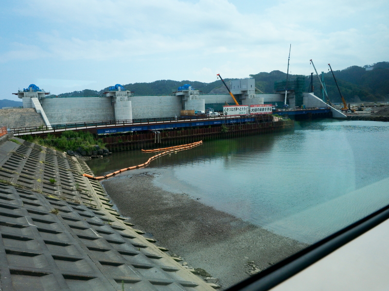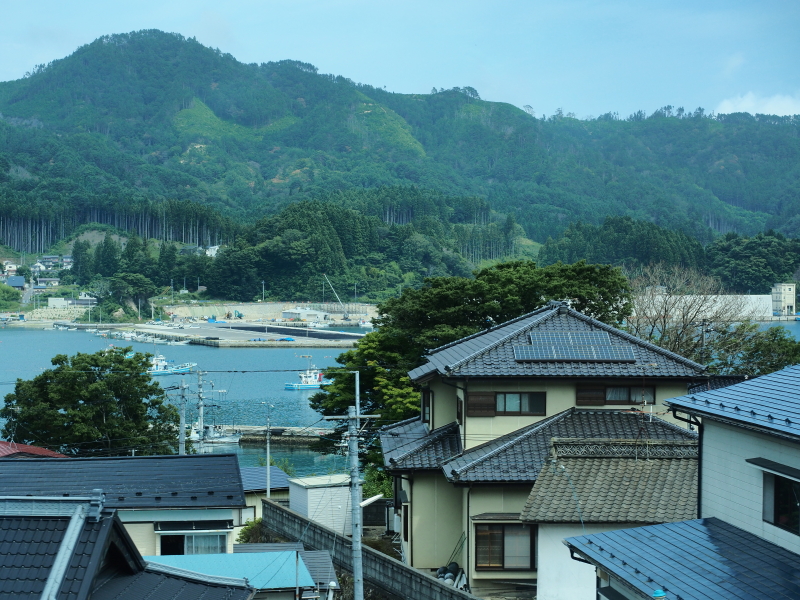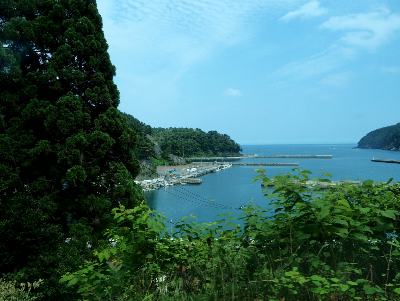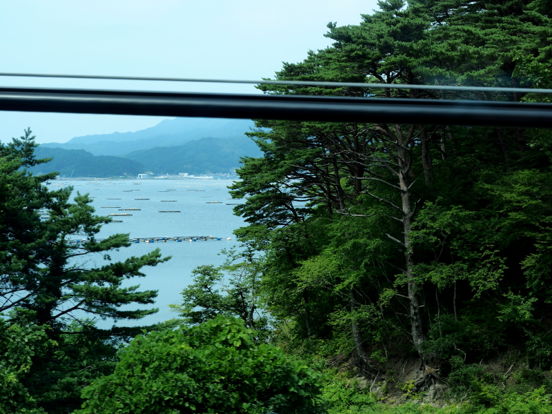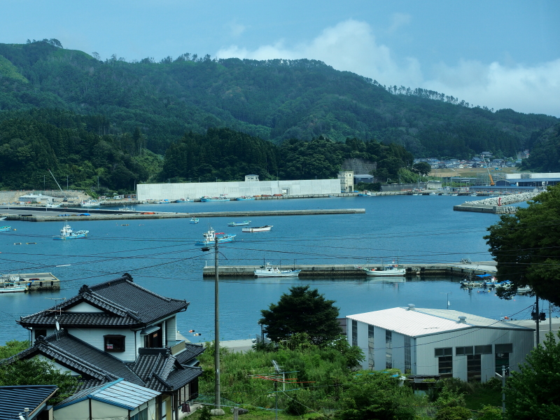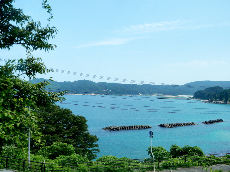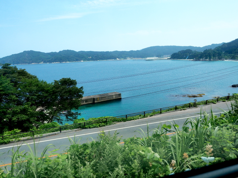 車窓から三陸海岸美がのぞめるものと期待したが、大防潮堤に遮られ美しい海を見られる場所はいがいと少なかった。