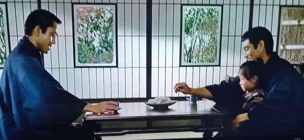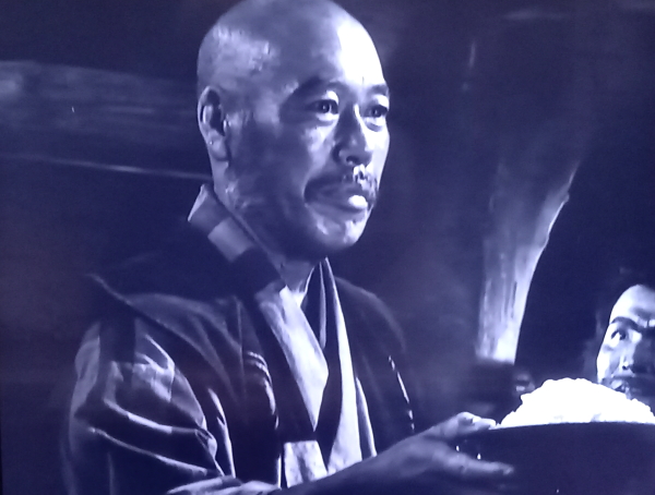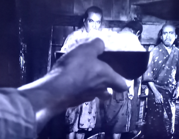 飯椀を受け取り、軽く押し頂き、「この白い飯、おろそかには食わぬぞ」勘兵衛がこうして百姓達の願いを聞き入れる。