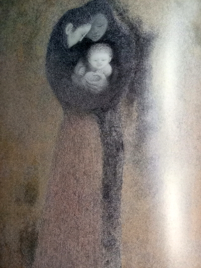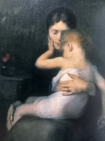 「若い母親が膝に子どもを抱いて坐っている。子どもは右手をだらりと下げているが、左手は母親の右頬にあて、額を母親の頬にすりよせている。母親は右手で子どもの背中をやさしく抱き、左手は足にそっとあてている。室内の淡い色調が親子のかぎりない抱擁をしっかりとつつんでいる。カリエ-ルの「病気の子ども」と題された1885年の作品。フランスの画家カリエ-ルは、エコ-ル・デ・ボ-ザ-ルに学び、はじめは色彩豊かな作品を描いていたが、晩年になると色彩をおさえた明暗の諧調による詩情的な世界を描くようになった。とりわけ慈愛にみちた母性を主題にした作品で知られる。門下からはマティスやドランが出ている。母性の画家カリエ-ルの数ある母子像のなかで、この「病気の子ども」は代表作といわれる。