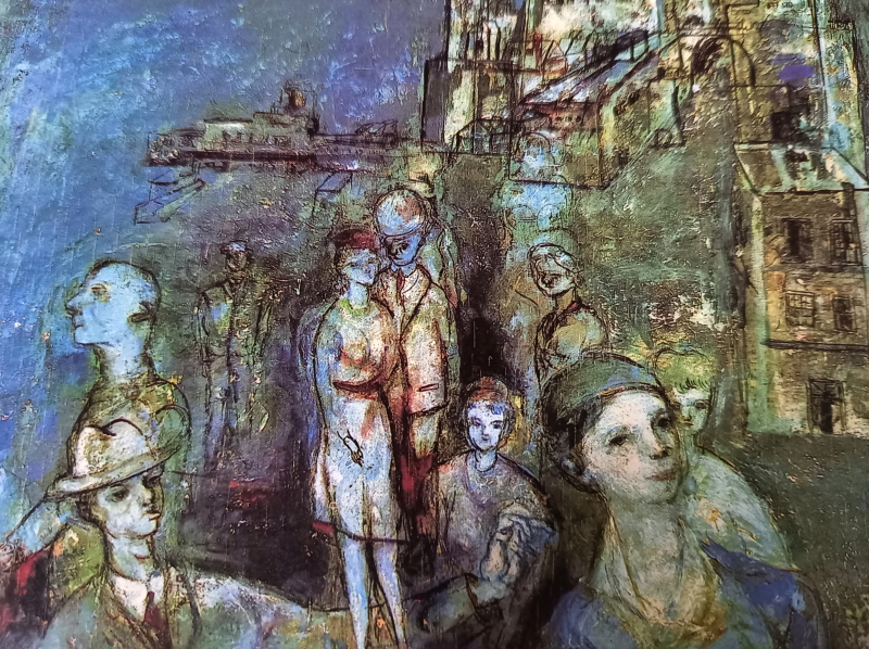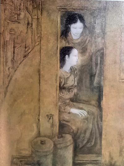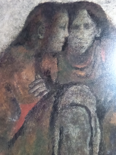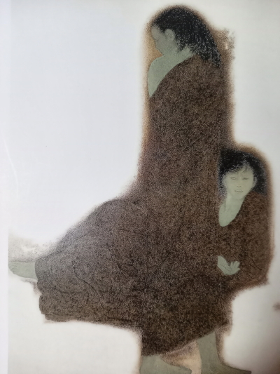 「-老人の胸に顔をうずめて泣いている女の子。その子をじっと見つめる老人と少年・・・・。老人は少女の祖父であろうか。少年は少女の兄であろうか。三人とも見るからに貧しい身なりである。女の子はなんで泣いているのであろうか。大事なものでも失ったのであろうか。それともだれかに叱られたのだろうか。・・この三人を包む暗緑色の画面かは、なにかふかぶかとした「物語」がただよってくる。ジャンセンは1920年に中央アジアのアルメニアで生まれた。アルメニア人は苦難の歴史を背負った民族で、彼も民族の受難の渦中で青春期を過ごし、パリで画家となった。この作品は何度か訪れたスペインのどこか貧しい町の路地裏で彼が目撃した情景であろう。彼が描くのはいずれも表の明るい場面ではなく、生活の吐息がもれる暗い部分である。全ては光と翳が存在している。美しいと思えるものはそこに翳が、美しいと思えないものがあるからだ。翳がなければ輝きも美しさも何もない。」 立川昭二