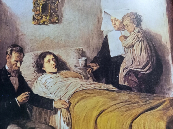 ムンク一家には病が絶えなかった。5歳の時優しい母親が結核で死んだ。14歳の時には姉ソフィエが母と同じ病で死ぬ。父は医者であったが、二人のいのちを救うことができなかった。家中で神に祈ったが無駄であった。・・ムンク自身が腺病質で病気がちな少年であった。