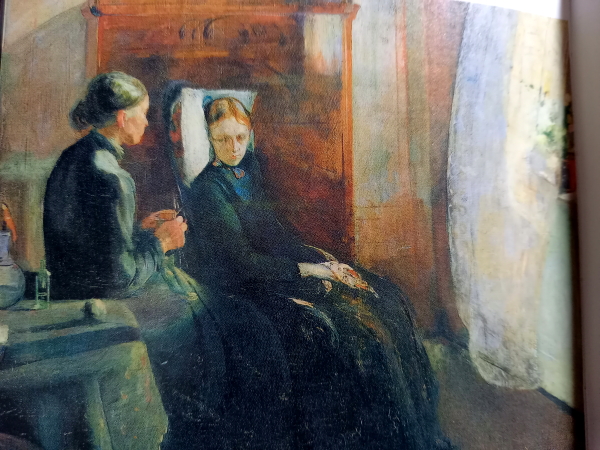 「病床を出てきた少女は、安楽椅子に静かにもたれ、久しぶりに浴びる陽差し頬に受け、蒼白い顔をやや斜めに傾け、膝に置かれたハンカチにそっと手を寄せている。かたわらの母親は編み物をしながら、赤みのさした横顔を、娘の病み衰えた面にじっと向けている。・・・モデルの少女はムンクが14歳のとき死んだ1つ歳上の姉ソフィエ。付きそう母親のモデルはムンクが幼いとき死んだ母親のかわりに彼を育ててくれた叔母カ-レン・・・・。人は悲しいとき手を動かすものである。ムンクの言葉-「私はこの世に死んで生まれた。・・・病いと狂気と死とが、私の揺籃を守る黒い天使たちであった。そしてそれからもずっと生涯を通じて私に付き添った。」