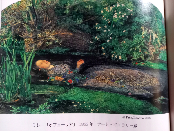 作品「オフェ-リア」はシェ-クスピアの名作「ハムレット」のなかの悲劇の女性オフェ-リアの死に題材をとつた。「恋人のハムレットに父親を殺されたオフェ-リアは錯乱し、小川で木の小枝に花輪をかけようとして枝が折れ、流れに落ちて溺死する。」この情景を再現するため、ミレ-はモデルにこだわった。ラファエル前派の画家が競って描いた女性-愛称がリジ-という18歳の彼女を4ヶ月以上にもわたってバスタブに満たしたお湯のなかでポ-ズをとらせたという。リジ-は若くして肺結核を患い、咳に苦しんだ。「オフェ-リア」が完成してから10年後、28歳で亡くなった。