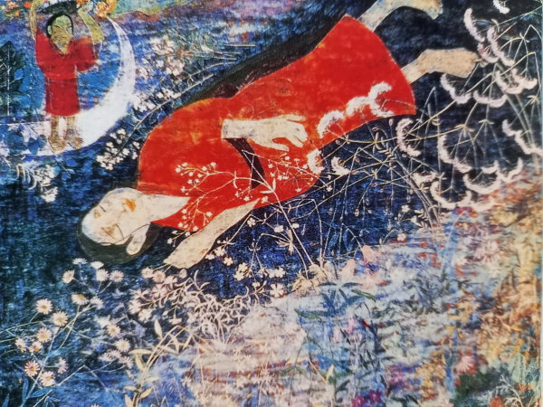 「1976年度の「芸術新潮」への連載に、わたくしは「女人無限」をテ-マとした。その中に「風土記」逸文にある伝承「伊香小江イカゴノオウミの天女」をいれ、伊香小江、余呉湖へでかけた。湧水の湖だという余呉湖は、折から雨のふっているせいもあって、ほとんど人気がなく静かだった。まるで海のように巨きな琵琶湖とちがって、余呉湖はこぢんまりした、いかにも湖らしい湖だった。湖畔で休もうとして、わたくしは、はっとした。白く明るい雰囲気とはまったく異る、暗い印象の絵がかかっていた。絵を撮った写真であった。この絵は、35歳で2人のお子をのこして亡くなった節子さんの絶筆「余呉の天女」であるという。鎖骨腫瘍のため右腕を切断した画家。夫君に病名を明かせれ、死の恐怖とたたかい、覚悟をかためながら、右腕切断から死までの二年間、さらに左腕で、みごとな画業を重ねた女人。わたくしは、「伊香小江の天女」の末尾で、この絵の写真に触れ、「彼女もまた、仮に人の世に降り立ったひとりの天女だった」と記した。」 岡部伊都子