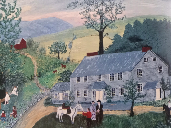 「この若々しい絵を描いた画家は、このときなんと90歳! しかも76歳ではじめて絵筆をとるまではアメリカの片田舎の一介の農婦だったのである。アンナ・メアリ-・ロバ-トソン・モ-ゼスは、ふつうグランマア・モ-ゼス(モ-ゼスおばさん)と呼ばれている。1860年に生まれ1961年に101歳で亡くなった。緑の草原と深い森に囲まれた農家に生まれ、早くから他人の家で働き、結婚してからは自分たちの農場を持ち、10人の子どもを育て、勤勉に誠実に働きとおした。夫の死後、リウマチが悪くなり、編み物もできなくなったので、ふと絵筆を握って板きれに絵を描き始めた。それが76歳のときである。以後亡くなるまでの25年間に千六百余点の作品を残した、その1点1点のどれもが世界中の人々から愛され、何枚枚というクリスマスカ-ドやカレンダ-になって人びとの手から手へと渡っていった。」 立川昭二