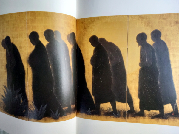 私は優れた古典を懸命に模写すると同時に、下宿では文学や哲学書を読み漁りました。・・・入学してから二年間、ひたすら精励したのも、劣等感に苛まされたり、不安にとらわれたする余裕さえないほどに、自分に課題を課すことによって無為な時間を埋め尽くそうとしたからです。・・三年目、読めでも読めども、描けども描けども、方向が見えてこず、そもそも自分の才能に自信が持てなくなったのです。・・・私の煩悶は続きました。救いを求めるように、古い仏画の模写と読書に打ち込んだ日々は、今振り返れば、後年、私が「仏教」に自分のテ-マを見いだすための、長く苦しい助走期間だったといえるのではないでしょうか。・・・経済的負担や被爆の後遺症の悪化に苦しめられ、絶望に押しひしがれながら、祈るような気持ちで、初めて仏教をテ-マとして「仏教伝来」を制作したのは、1959年のことでした。」 -平山郁夫