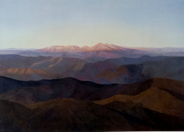 「残照」は、「道」と並んで私の好きな作品である。昭和21年、東山さんは残った最後の肉親である母と弟をあいついで亡くした。さらにその年の初の日展にも落選した。失意の中で人生の意味を問い直し、そして自身の絵の在り方を探求し続ける、そんな東山さん自身の姿がこの風景と重なってみえるように思う。「絵を描く」という東山さんのの孤独な行為が「祈り」という姿勢を通して、「自然と一体化」している・・・。千葉房総の鹿野山のスケッチがもとになっているというが、実景というよりも画家の心象風景である。遠くに見える山々は信州の山容に似ている。-鈴木慶治