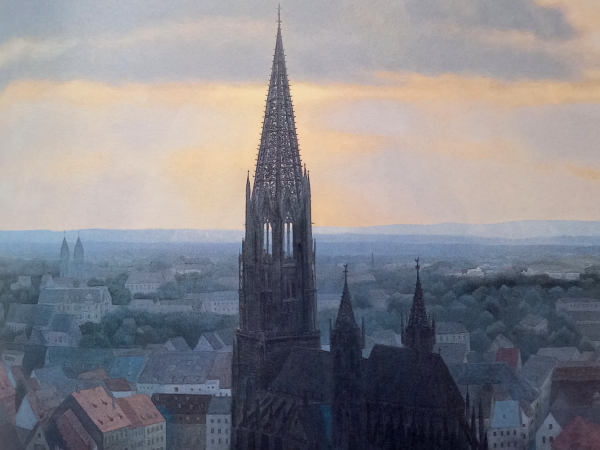 フライブルクの夕暮れの情景である。地平線はほのかに明るく、垂直に立つ尖塔は影となって暗い。そこから、安らぎや荘厳さといった象徴性が漂う。雲間から放たれる光が、天を目指した塔の真上に輝く光景は、東山の共感するドイツの精神性に与えられた神の祝福であったかも知れない。