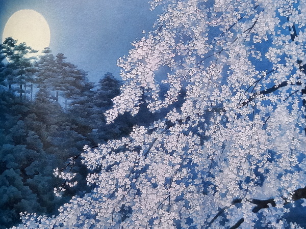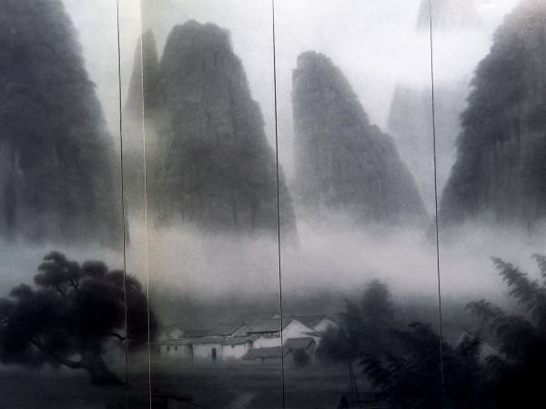 東山さんは1976(昭和51)年初めて中国を訪れた際に、桂林にも足を運んだ。桂林の中心を流れる川を船に乗って下り、その景観に神が地上に空想の世界かと感嘆したという。一見水墨画のように見えるが、墨ではなく岩絵の具によって彩色されている。「生誕100年東山魁夷展」作品解説から