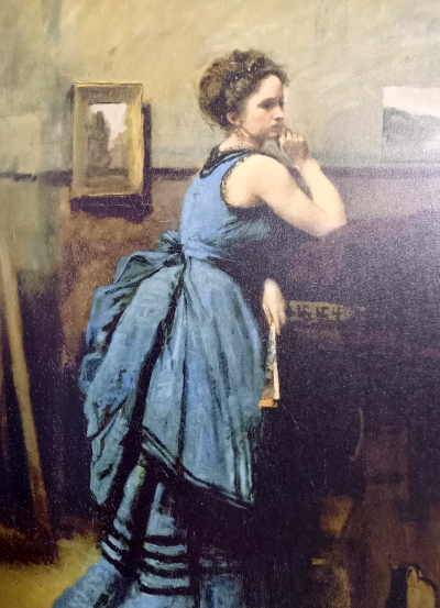 <青い服の婦人> 1874年 1900年のパリの万国博覧会で初めて公開されセンセ-ションを巻き起こす。コロ-78歳の作品。モデルはエマ・ドビニ-といいコロ-のモデルを5年来務めていたという。人物画としてのコロ-の絶頂であり最も重要な作品である。-図版から