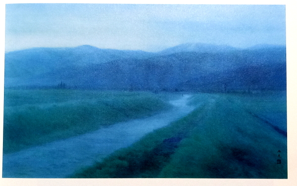 「川が流れていた。両岸の草のなびく堤の上は細い道になっていて、遙か遠くへ遠くへと続いている。川が遠くの方で曲がって消えるあたりに、小さな橋がかかっていた。田園の向こうに、ゆるやかな山なみ。茅野から諏訪へ向かって歩いていくうちに、ふと、通りがかりに見た風景が私を捉えた。心が惹かれるままに簡単なスケッチをした。この全く平凡な風景の中に何があるのか。数日を経ても、意外に私の心に、その情景が根深く、静かな映像となって息づいているのを感じる。私の心を誘うように、深いところから呼んでいるものがある。・・・」