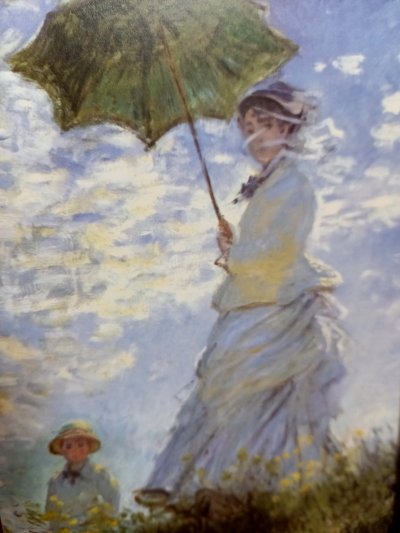 「モネが日傘のカミ-ユを描いた作品が残されている。モネとカミ-ユが出会ったのは、ルノワ-ルと画風を模索していた頃。二十代なかばのモネと十代終わりのカミ-ユは意気投合して一緒に暮らし始める。結婚したのは、サロンで評価を得られないままモネが三十歳を迎えた年。すでに三年前、貧窮のなかでカミ-ユは長男ジャンを出産していた。ようやくモネを支援する画商やパトロンが出てきたのが、この結婚の少し後からだったが、長く続いた貧窮は確実にカミ-ユの体を蝕んでいた。白いドレスの彼女を見上げる画面は・・・ベ-ルが薫風でカミ-ユの顔にたわむれている。かたわらに立つ息子ジャンの正面向きのポ-ズが、斜めに向いたカミ-ユの美しさを強調している。・・幸福に満ち満ちて映る画面ながら、この夏、彼女は病に倒れて四年後に夫の栄光を見ることもなく世を去っている。18歳でモネと出会い32歳で亡くなるまで、画家の不遇を分かち合った14年間の労苦が報われることはなかった・・」-西岡文彦