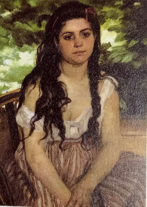 「恋のさなかにあった28歳のルノワ-ルが、彼女をモデルに描いてサロンに出品した作品は、<ボヘミアの女>と名付けられている。18歳でルノワ-ルと恋におちたリ-ズが、建築家ジョルジュ・ブリエ-ルと結婚するのは24歳の時。小説やオペラの中では真実の愛を勝ち取るボヘミアンだったが、無名のルノワ-ルが恋したボヘミアンの女神は貧しい芸術家のもとを立ち去り、以後、二度と彼に会おうとはしなかった。ボヘミアの女リ-ズが去った時、おそらくルノワ-ルの青春もまたひとつの終わりを迎えたのであろう。しきりにモネの家を訪ねては若妻カミ-ユを描いたいた当時、カミ-ユの姿に、自身がリ-ズと共にすることのできなかった幸福を見出していたのかもしれない。ルノワ-ルが、生涯の伴侶となるアリ-ヌ・シャリゴと出会ったのは、リ-ズが去って8年後のこと。じき40歳になろうとしていた。明朗快活を絵に描いたような女性であったという彼女との間に、5年後、長男ピエ-ルが誕生、その5年後に二人は正式に結婚している。以降、25年の結婚生活を共にするが、アリ-ヌは持病の糖尿病と息子を第一次世界大戦に送った心痛から50代なかばでなくなってしまう。残されたルノワ-ルは70代なかば。その少し前から、リュ-マチで麻痺した手に筆を縛り付けて車椅子で制作するようになっていた。・・・晩年のルノワ-ルに会った人は皆、彼の手の惨状に茫然としたという。」-西岡文彦
