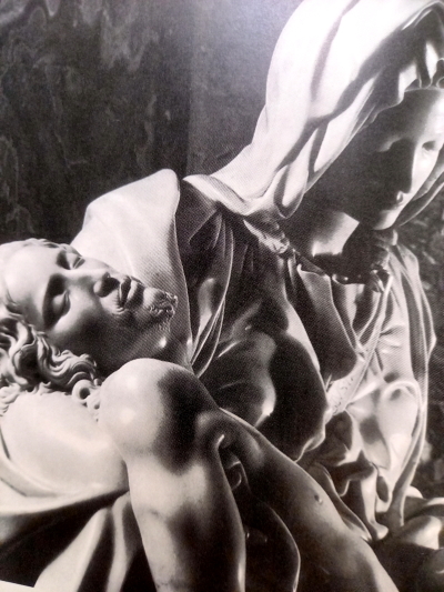 -久遠に若い「処女」の膝の上に、死せるキリストは眠れるように横たわっている。清純なる女神と受難の神の顔には天上の端厳さが漂っている。けれどもまたそこには言い現わしがたい憂愁が溶け、二つの美しい姿を浸している。悲哀がミケランジェロの魂に乗り移ったのであった。