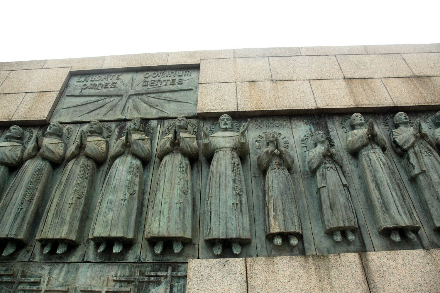 「舟越氏はこの像制作にあたり、殉教者が歩いた行程を自ら歩き、資料を読み込み、二十六人のひとりひとりが最もその人らしいと納得できるまで何度も作り直し、完成までの4年間はアトリエで像と起居をともにする日々を送る。当初のテ-マは「処刑の情景」であったが、保武氏は二十六人の像を一列に並べ天を仰ぎ聖歌を合唱しながら昇天する姿に作り、丘を登ってきて記念像にはじめて接するとき、遠くから大きなブロンズの十字架に見えるように制作した。1958年~1962年・氏46歳から50歳の制作。第5回高村光太郎賞を受賞。」