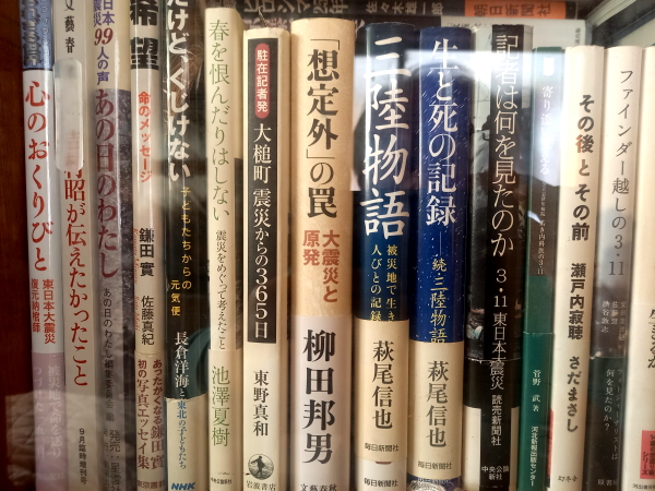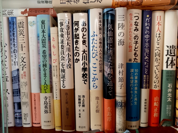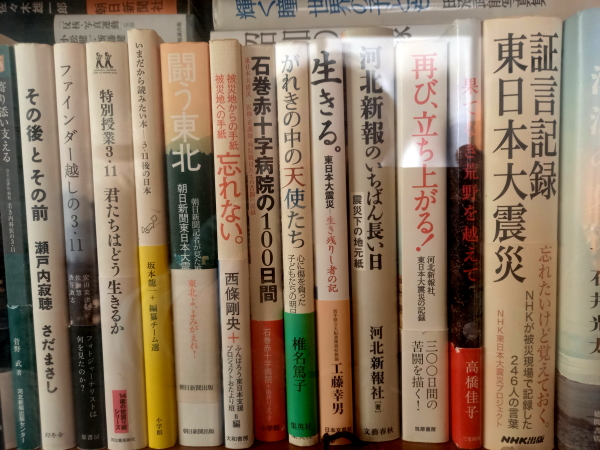 「心のおくりびと」-東日本大震災復元納棺師・今西乃子/「あの日のわたし」-東日本大震災99人の声・星雲社/「希望-命のメッセ-ジ」・鎌田 實/「だけどくじけない」・長倉洋海/「日本を信じる」・瀬戸内寂聴、ドナルド・キ-ン/「春をうらんだりしない」・池澤夏樹/「遺体」・石井光太/「津波の墓標」・石井光太/「三陸物語」・萩尾信也/「生と死の記録」・萩尾信也/「寄り添い支える」-公立志津川病院内科医の3.11・菅野武/「三陸の海」・津村節子/「三陸海岸大津波」・吉村昭/「大槌町震災からの365日」・東野真和/「その後とその前」・さだまさし、瀬戸内寂聴/「特別授業3.11君たちはどう生きるか」・河出書房新社/文藝春秋 「つなみ」-被災地の子ども80人の作文集/文藝春秋 「つなみ」-5年後の子どもたちの作文集/「つなみ」の子どもたち-作文に書かれなかった物語/「気仙沼に消えた姉を追って」・生島淳/「ファインダ-越しの3.11」・安田菜津紀、佐藤慧、渋谷淳志/「再び立ち上がる」・河北新報社/「河北新報社のいちばん長い日」・河北新報社/「いまだから読みたい本」-3.11以後の日本・坂本龍一+編纂チ-ム編/「闘う東北」・朝日新聞社/「記者は何を見たのか3.11」・読売新聞社/「がれきの中で本当にあったこと」・産経新聞社/「被災地からの手紙、被災地への手紙」・西條剛央/「石巻赤十字病院の100日間」・石巻赤十字病院/「がれきの中の天使たち」・椎名篤子/「生きる」-生き残れし者の記・工藤幸男/証言記録「東日本大震災」・NHK出版/「石巻の人たちの50日間」-ふたたびここから・池上正樹/石巻市立大川小学校「事故検証委員会を検証する」・池上正樹、加藤順子/「あのとき大川小学校で何が起きたのか」・池上正樹、加藤順子/東日本大震災-「希望の種をまく」・寺島英弥/「明日へ」-東日本大震災の記録・NHK東日本大震災プロジェクト/「震災三十一文字-鎮魂と希望」・NHK「震災を読む」取材班編/東日本大震災詩歌集-「悲しみの海」・谷川健一、玉田尊英編/「HOPE311」-陽また昇る・バ-ビ-・山口/「ここから始まる」・広田泉/「あの日」のこと・高橋邦典/「HOME-美しき故郷よ」・宍戸清孝写真集/「THE