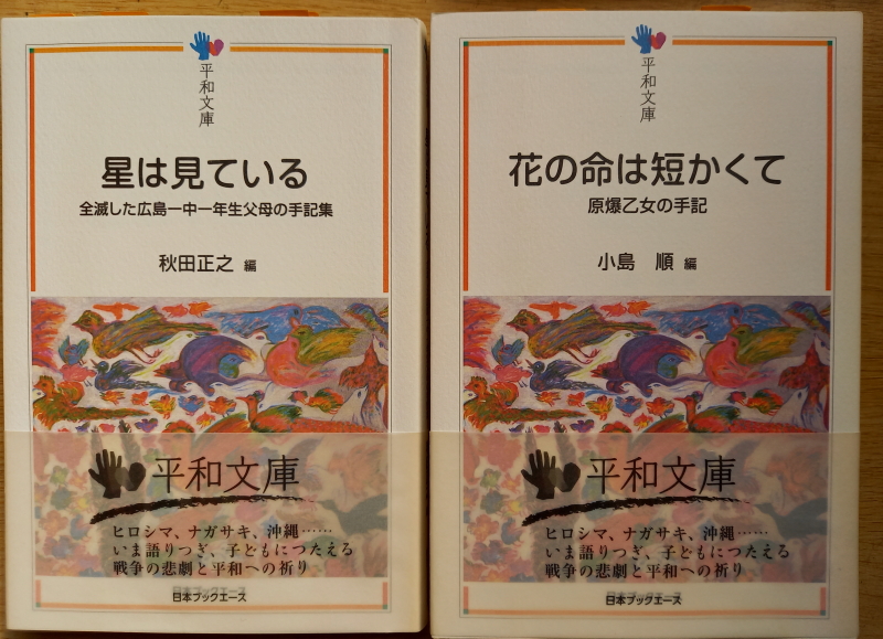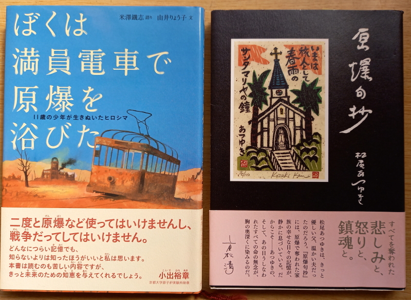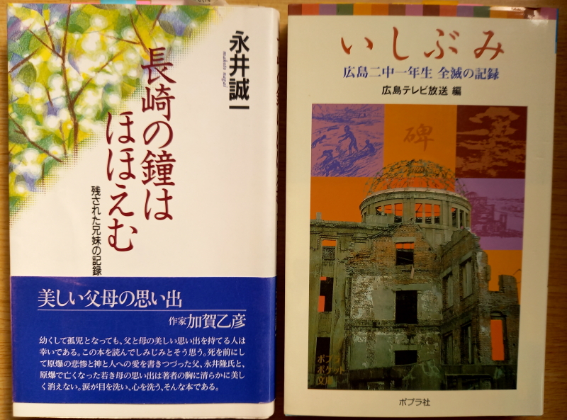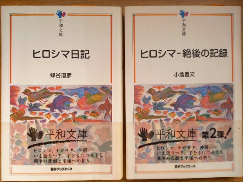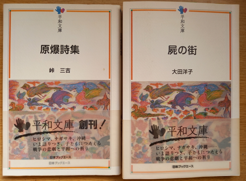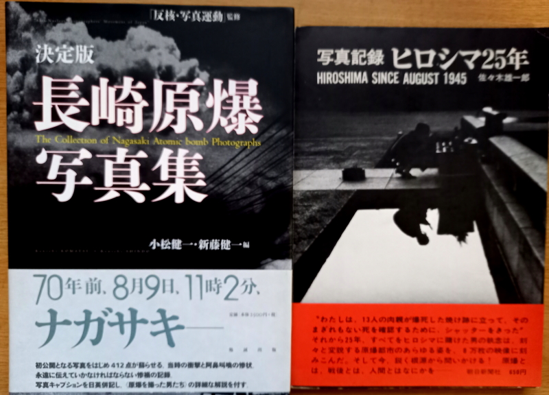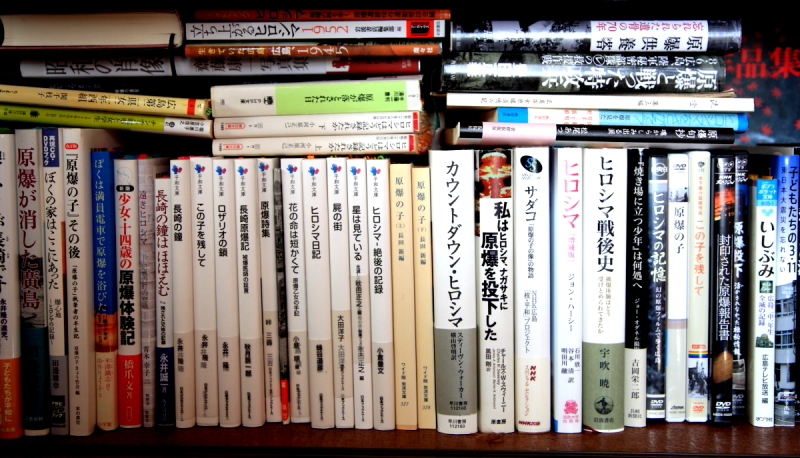 「平和のバトン」広島の高校生たちが描いた8月6日の記憶・弓狩匡純・協力、平和記念資料館2019.6/「原爆句抄」・松尾あつゆき2015.3.20/「命かがやいて」・大西知子2011.2.1/「なみだのファインダ-」・柏原知子監修2003.8/ 「HIROSHIMA-半世紀の肖像・大石芳野1995.3.3/「死の同心円」・秋月辰一郎2011.6.30/「広島爆心地中島」・広島遺跡保存運動懇談会編2006.8/「ヒロシマを壊滅させた男 オッペンファイマ-」・ピ-タ-・グッド・チャイルド・池澤夏樹訳1995.6.15/「ヒロシマ戦後史」・宇吹 暁2014.7.9/「ヒロシマ」・ジョン・ハ-シ- 谷本清、他訳1949.4.25 /「サダコ 原爆の子の像の物語」・NHK広島「核・平和」プロジェクト2000.7.30/「私はヒロシマ・ナガサキに原爆を投下した」・チャ-ルズ・W・スウィニ- 黒田剛訳2000.7.31/「カウントダウンヒロシマ」・スティブン・ウォ-カ- 横山啓明訳2005.7.10広島を復興させた人びと「原爆」・石井光太2018.7.10/「原爆と戦った特攻兵」・豊田正義2015.7.31/「原爆供養塔」-忘れられた遺骨の70年-・堀川惠子2015.5.25/「遠きヒロシマ」-記憶の物語-・青木幸子2014.11.10/「空が赤く焼けて」-原爆で死にゆく子たちの8日間・奥田貞子2015.6.30/「少女十四歳の原爆体験記」・橋爪 文2001.7.20/「ヒロシマ絶後の記録」・小倉豊文2010.12.10/「星は見ている」-全滅した広島一中一年生父母の手記集・秋田正之編2010.12.10/「ヒロシマ日記」・蜂谷道彦/「花の命は短くて」-原爆乙女の手記・小島 順/「屍の街」・大田洋子2010.7.25/「長崎原爆記-被爆医師の証言」・秋月辰一郎/「この子を残して」・永井 隆2010.7.25/「ロザリオの鐘」・永井 隆2014.6.25/「長崎の鐘」・永井 隆2010.7.25/「原爆詩集」・峠 三吉2010.7.25/「廣島-戦争と都市-」・岩波写真文庫/「長崎の鐘はほほえむ」-残された兄妹の記録-・永井誠一1995.5.20/「ぼくは満員電車の中で原爆を浴びた」-11歳の少年が生きぬいたヒロシマ・由井りょう子 文2013.7.16米澤鐵志 絵/「原爆の子」上・長田 新編/「原爆の子」下・長田 新編/「原爆の子」その後-原爆の子執筆者の半世記・原爆の子きょう竹会編/「ぼくの家はここにあった」-爆心地~ヒロシマの記録-付録DVD復元中島町・田邊雅章/よみがえった都市-復興の軌跡「原爆市長」復刻版浜井信三/「原爆が消した廣島」・田邊雅章/「娘よここが長崎です」-永井 隆の遺児茅乃の平和への祈り・筒井茅乃/「永井 隆」・永井誠一/「ヒロシマはどう記録されたか」上・小河原正己/「ヒロシマはどう記録されたか」下・小河原正己/「焼き場に立つ少年」は何処へ・ジョ-・オダネル・吉岡栄二郎/「ガイドブックヒロシマ」-被爆の跡を歩く-・原爆遺跡保存運動懇談会編/「いしぶみ」-広島二中一年生全滅の記録・広島テレビ放送編/「ヒロシマをさがそう」-原爆を見た建物・山下和也、井手三千男、叶 真幹/「原爆が落とされた日」・半藤一利、湯川 豊「チンチン電車と女学生」・堀川惠子、小笠原信之/「牧師の涙」・川上郁子/「HIROSHIMA1958」・エマニュエル・リブァ写真/「長崎旧浦上天主堂」1945-1958 失われた被爆遺産・高橋 至、写真、横手一彦、文/「ヒロシマから問う」平和記念資料館の「対話ノ-ト」編集委員会編「被爆の遺言」・被災カメラマン写真集/「昭和二十年代~三十年代 百二十八枚の広島」・明田弘司写真/「生きていた広島 広島1945」南々社立ち上がる広島・1952 岩波書店編集部編/「写真記録 ヒロシマ25年」佐々木雄一郎/「決定版 長崎原爆写真集」小松健一、新藤健一編/「広島・長崎 原子爆弾の記録」・平和のアトリエ/集英社 戦争と文学 第19巻 「ヒロシマ ナガサキ」-閃-/「ヒロシマを伝える-詩画人 四國五郎と原爆の表現者たち」・永田浩三/「広島第二県女二年西組」・関千枝子/「原爆死真実」-きのこ雲の下で起きていたこと・NHKスペシャル取材班/「原 民喜全集 全二巻」-夏の花・原 民喜/「ヒロシマ 消えたかぞく」-このえがおがずっとつづくとおもっていた-・指田 和、写真 鈴木六郎/「おこりじぞう」・絵 四國五郎 文 山口勇子/「トランクの中の日本」・ジョ-・オダネル/「黒い雨」・井伏鱒二/「死の島」上・福永武彦/「死の島」下・福永武彦/「浦上物語」・市川和広/「ヒロシマ」土門拳全集10・小学館/「長崎の痕」・大石芳野写真集/大石芳野写真集「戦争は終わっても終わらない」/広島平和記念資料館臓・撮影、土田ヒロミ「ヒロシマ・コレクション」/「ヒロシマを暴いた男-米国人ジャ-ナリスト、国家権力への挑戦 レスリ-・M・M・ブル-ム 集英社/「空白の天気図」柳田邦男 文春文庫/「ヒロシマ爆心地」-生と死の40年 1986年7月20日 第1刷 日本放送出版協会発行/
