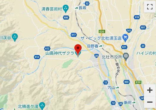 須玉IC~国道141号~「薬師堂橋東詰」交差点左折~県道611号~県道612号~「神代桜」の看板。